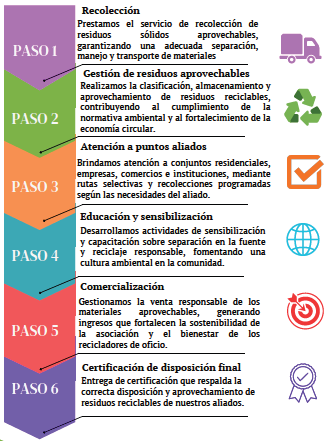 Este servicio hace parte de nuestro enfoque de manejo integral de residuos sólidos reciclables, e incluye todas las etapas: